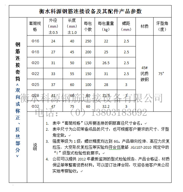 鋼筋剝肋滾軋直螺紋連接,就是將待連接鋼筋端部的縱肋和橫肋用切削的方法剝掉一部分,然后直接滾軋成普通直螺紋,用特制的直螺紋套筒連接起來,形成鋼筋的連接。鋼筋連接套筒特點(diǎn)1、使用鋼筋連接套筒可以降低材料的使用,而且操作簡便,不受鋼筋成份種類限制。2、鋼筋連接套筒可提前預(yù)制,不占工期,加工效率高。3、連接方便、快捷、簡單,施工不用電,風(fēng)雨無阻,可全天候施工。4、可連接橫、豎、斜向的HRB335、HRB400、HRB500同徑或異徑鋼筋。服務(wù)方式 1、提供φ16-φ40mm規(guī)格鋼筋的直螺紋連接套筒2、提供鋼筋直螺紋加工設(shè)備3、負(fù)責(zé)施工現(xiàn)場技術(shù)培訓(xùn)及設(shè)備維修服務(wù)。直螺鋼筋連接套筒規(guī)格型號如下: φ16-φ40普通鋼筋連接套筒、異徑鋼筋連接套筒、可調(diào)鋼筋連接套筒、特殊型鋼筋連接套筒。