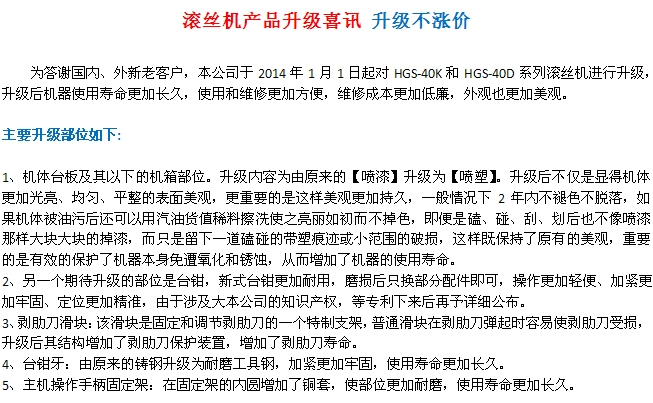 HGS-40DZ型滾絲機(jī)特性:HGS-40DZ型滾絲機(jī)是為滿足廣大客戶要求,在40D型基礎(chǔ)上對電器控制系統(tǒng)進(jìn)行了改進(jìn),自動(dòng)化程度提高,工人操作更加省時(shí)省力。提高了工作效率。